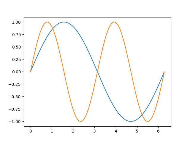 ok,我们看下面的一串代码,描绘的是sin(x)和sin(2x)在同一幅图像上的样子;
